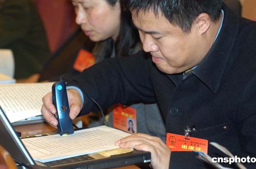 一月二十五日,北京市十二屆人大三次會議舉行第二次全體會議,有人大代表在會上用電子掃描筆將重點報告內(nèi)容掃描存入電腦。作者:張宇