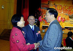 一月三十日,“二○○五年廣西首府僑界迎春茶話會(huì)”在南寧舉行,三百多名僑界人士到會(huì),世界廣西同鄉(xiāng)聯(lián)誼會(huì)主席陳奇培、馬來(lái)西亞廣西總會(huì)會(huì)長(zhǎng)孔慶庶等海外僑領(lǐng)也出席了茶話會(huì)。廣西自治區(qū)政府副主席劉新文女士(左)、廣西自治區(qū)僑辦主任李漢金(中)和出席茶話會(huì)的海外僑領(lǐng)親切交談。作者:劉萬(wàn)強(qiáng)
