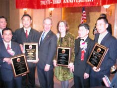 彭博市長和顧雅明理事長隨后在會上為六個(gè)機(jī)構(gòu)和個(gè)人頒獎(jiǎng),香港匯豐銀行資深副總裁何永雄榮獲小型企業(yè)貸款服務(wù)獎(jiǎng);美國福華商會會長王家鶯榮獲小商家杰出人士獎(jiǎng);拉瓜地亞社區(qū)學(xué)院榮獲社區(qū)服務(wù)獎(jiǎng);新任州眾議員孟廣瑞榮獲公共服務(wù)獎(jiǎng);紐約韓人會會長金光植榮獲社區(qū)友誼獎(jiǎng)等。最后,顧雅明并代表該會為彭博市長頒發(fā)一項(xiàng)“廉政服務(wù)獎(jiǎng)”。