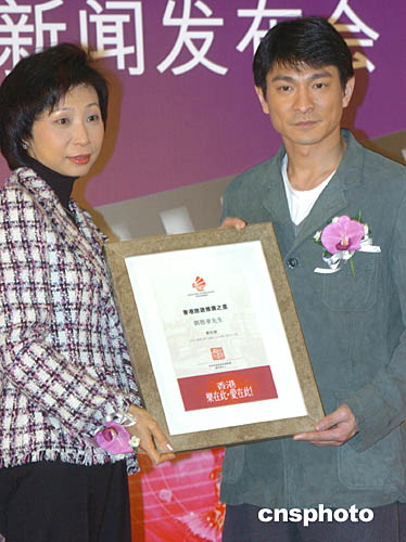 展示香港旅游特色的電視專題片《星星細(xì)語香港情》2月1日在香港開鏡﹐在新聞發(fā)布會上﹐香港旅游發(fā)展局總干事臧明華(左)向在劇中擔(dān)任主角的劉德華致送委任狀。