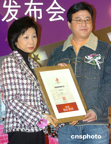 展示香港旅游特色的電視專題片《星星細(xì)語香港情》2月1日在香港開鏡﹐在新聞發(fā)布會上﹐香港旅游發(fā)展局總干事臧明華向在劇中擔(dān)任主角的“網(wǎng)絡(luò)精英”丁磊(右)致送委任狀。