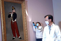 圖為藝術(shù)館工作人員精心布置愛德華·馬奈名畫《吹笛子的男孩》。