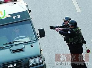 春節(jié)期間,為加強(qiáng)對(duì)金融單位的保護(hù),北京市公安局進(jìn)行了一次攔截被搶運(yùn)鈔車的演習(xí)。下午1時(shí)30分左右,左安門橋下的南二環(huán)向西的主路上,車流如梭,一輛綠色的北京振遠(yuǎn)護(hù)衛(wèi)運(yùn)鈔車在車流中見縫插針地飛速前行,三四輛警車緊隨其后,旁邊的車輛很快讓出路來?匆妿讉(gè)路口全部有警方布控后,運(yùn)鈔車?yán)^續(xù)朝前“逃竄”,并從開陽橋往北,駛向菜市口大街。