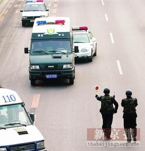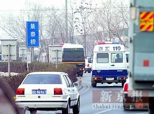在健宮醫(yī)院西門口,菜市口大街由南向北主路停止行車。三名刑警呈三角狀,站在主路中央。約5分鐘后,三輛警車夾著一輛綠色的運(yùn)鈔車駛來,在離“三人陣”50米遠(yuǎn)處,前排的刑警對(duì)運(yùn)鈔車舉起禁行標(biāo)志。與此同時(shí),兩輛警車向運(yùn)鈔車靠攏。