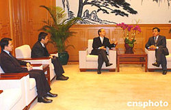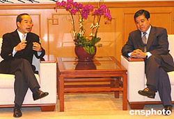 外交部駐港特派員楊文昌2月4日在香港外交部駐港公署會(huì)見香港民建聯(lián)立法會(huì)議員劉江華﹐就為去年印度洋海嘯災(zāi)難中受困港人提供協(xié)助及涉港領(lǐng)事保護(hù)等問題進(jìn)行了交談。中新社記者:趙振清