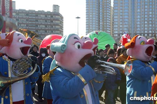 二月九日中國(guó)傳統(tǒng)春節(jié),盡管天寒地凍,但是在北京朝陽(yáng)公園的國(guó)際風(fēng)情節(jié)上卻激情燃放。當(dāng)天開幕的二零零五年北京朝陽(yáng)國(guó)際風(fēng)情節(jié),為京城的市民奉獻(xiàn)了一臺(tái)中西文化大餐。圖為開幕式上盛裝游行隊(duì)伍中的卡通樂(lè)隊(duì)。作者:任海霞