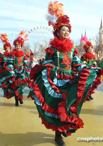 二月十日農(nóng)歷大年初二,北京石景山游樂園為北京百姓奉獻(xiàn)一道節(jié)日大餐——第五屆北京洋廟會(huì)。圖為身著艷麗西班牙節(jié)日盛裝的姑娘們,在石景山游樂園推出的特色品牌活動(dòng)——花車行進(jìn)表演中載歌載舞。作者:張勤