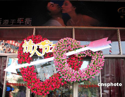 2005年2月11日下午,江蘇省如東縣的商家們“情人節(jié)”促銷忙,各種與節(jié)日有關(guān)的商品琳瑯滿目,各種標(biāo)識十分搶眼。作者:王必春