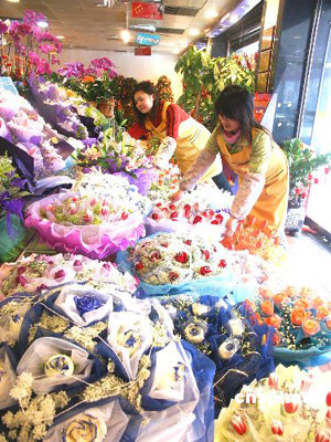 2月14日是“情人節(jié)”,南京各大花店準備制作的百合、玫瑰、郁金香等各種手捧鮮花,已擺滿了店堂,供情侶們前來挑選。圖為太平北路一家花店的員工在忙著擺放剛制作的手捧鮮花。作者:谷昌旺