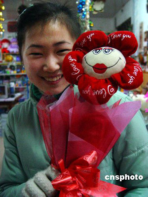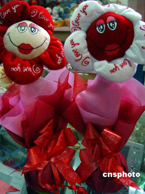 2月13日,在仙居縣一禮品商場,女青年在挑選“會說話”的“電動玫瑰”。這種用布娃造型的玫瑰,內(nèi)安裝了馬達和發(fā)聲器,輕搖“玫瑰”會發(fā)出“我愛你”之類的聲響!扒槿斯(jié)”前夕,商家挖空心思、別出心裁推出“會說話”的電動玫瑰,深受青年朋友喜愛。作者:華文武