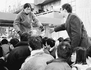 10時(shí)左右,人越來越多,市場(chǎng)前的紅旗路上人擠著人,綿延1公里,抬腳都困難,人群中不斷傳出被踩到腳的尖叫聲,10分鐘時(shí)間里,記者愣是沒走出200米。汽車、自行車和小商販的三輪車夾在人群中間動(dòng)彈不得,209路公交車無奈只好改線,一位乘客嘟囔著:“早就該實(shí)行交通管制!彪m然主辦方明確規(guī)定不得在場(chǎng)外招聘,可路邊的“招聘”牌子還是一個(gè)挨著一個(gè),散發(fā)的各種小廣告隨地可見,5元一張的門票被炒到10元。