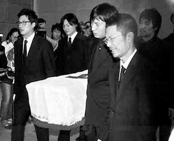 7時30分左右,文根英代表參加告別儀式的電影人宣讀了追悼詞———“善良、誠實的你就像火花一樣一閃而過,就這樣永遠離開了我們……你的笑容和你的聲音、你的一舉一動都會留在我們的心中……你帶著最美好的回憶和美麗的心,安心地走吧……”接著是由池成朗讀了韓國著名詩人的悼念詩。最后,李恩珠生前好友BADA和歌手全仁權(quán)分別通過歌聲來追悼故人,通過歌曲表達了無比的悲痛和遺憾。BADA現(xiàn)場演唱了李恩珠平時最喜歡的頌歌,這時參加儀式的所有人開始給李恩珠獻花,為故人的靈魂祈福,愿她一路走好。