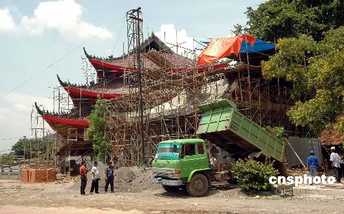 為紀(jì)念鄭和七下西洋六百周年,印尼三寶壟正在新建一座新的三寶公廟,面積三千五百平方米,廟宇寬大,氣宇軒昂,廟后鄭和七下西洋巨幅壁雕,人物逼真,氣勢(shì)磅礴。記者:蔣振江