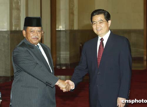 中新社北京二月二十八日電 (記者 朱大強(qiáng))中國國家主席胡錦濤今天在人民大會(huì)堂會(huì)見了馬來西亞最高元首西拉杰丁。