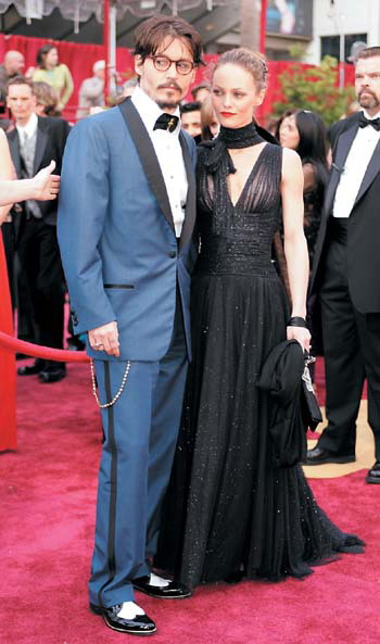 性格男星約翰尼·德普在著裝方面,向來(lái)不走尋常路。這回他不但又另類了一把,還將女友也“拉下水”。德普穿了身明藍(lán)色的西裝,墨黑色的領(lǐng)結(jié)上,還繡了暗黃色的圖案;西裝內(nèi)的白色襯衣倒還中規(guī)中矩;他的腰間吊了條金色的掛件;最吸引人眼球的還屬德普腳下那雙黑白兩色的皮鞋,特別是鞋頭的圖案,竟是個(gè)大大的白色桃心,整個(gè)怪異的裝束,配上德普冷漠詭異的神情,活脫脫一副僵尸派頭,簡(jiǎn)直賺足了噱頭。