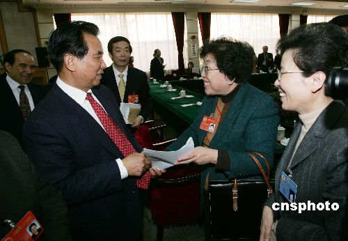中新社北京三月四日電 中共中央政治局常委吳邦國、溫家寶、曾慶紅、黃菊、吳官正、李長春、羅干四日下午分別看望出席全國政協(xié)十屆三次會議的委員,并參加了分組討論,與政協(xié)委員共商國是。