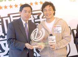 歌星陳奕迅3月4日在香港出席由新城電臺娛樂臺主辦‧主題贊助《新城唱好陳奕迅05’出擊音樂會》記者會,音樂會贊助商新世界電訊市務(wù)副總裁洪秋偉向陳奕迅頒贈記念品以示鼓勵。音樂會將于三月二十七日晚假會展新翼舉行。作者:鄧慶樂