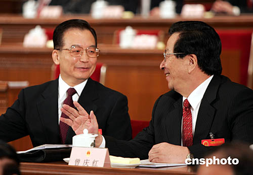 圖:溫家寶和曾慶紅在人大開幕會上交談
