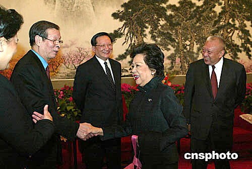 國(guó)家主席胡錦濤三月五日在北京會(huì)見香港特別行政區(qū)行政長(zhǎng)官董建華,國(guó)務(wù)委員唐家璇、國(guó)務(wù)院港澳辦主任廖暉等在會(huì)見后與特首夫人互致問候。作者:滿會(huì)喬