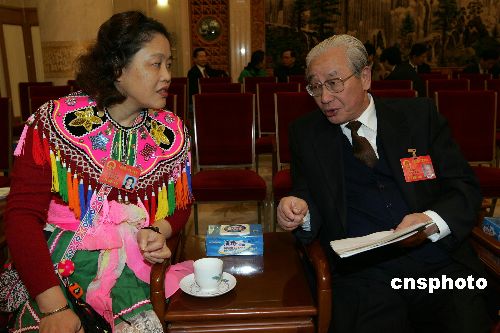 十屆全國(guó)人大三次會(huì)議三月五日在北京人民大會(huì)堂開幕,臺(tái)灣省代表?xiàng)顕?guó)慶與胡亞芳在休息室交談。作者:毛建軍