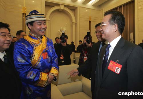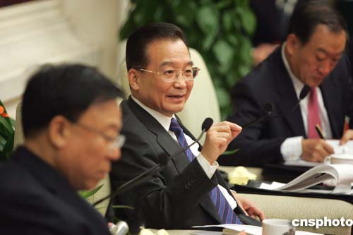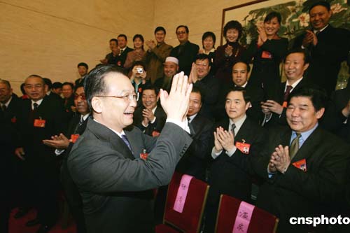 國務(wù)院總理溫家寶三月五日下午與出席十屆全國人大三次會(huì)議的甘肅代表一起審議政府工作報(bào)告。作者:毛建軍