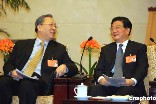 中共中央政治局常委、國務(wù)院副總理黃菊,三月七日到全國人大遼寧代表團(tuán)和代表們一起審議政府工作報(bào)告。圖為黃菊聽取全國人大常委會副委員長、中國科學(xué)院院長路甬祥發(fā)言。作者:湯彥俊