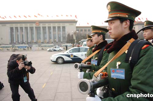 三月九日,一位采訪“兩會”的攝影記者在天安門廣場拍攝值勤的武警戰(zhàn)士。作者:陳文