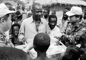 利比里亞地處西非,原是一個美麗富饒的國度。然而,長達(dá)14年的內(nèi)戰(zhàn),使這個苦難的國家政局動蕩、戰(zhàn)亂困擾、經(jīng)濟(jì)近乎崩潰。2003年11月,奉國務(wù)院、中央軍委命令,以福州總醫(yī)院醫(yī)務(wù)人員為主體組建的南京軍區(qū)首支赴利比里亞維和醫(yī)療分隊成立。這支包括32名男隊員和11名女隊員的醫(yī)療分隊,有外科、內(nèi)科、眼科、牙科以及麻醉、藥劑、檢驗、放射醫(yī)師和重癥監(jiān)護(hù)護(hù)士、手術(shù)護(hù)士、衛(wèi)生員,還有駕駛員、通信技師、水電工、廚師等保障人員。