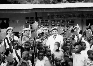 望著這些可憐的孩子,潘興太等隊員決定親自動手,利用原來裝醫(yī)療用品的木箱,為師生制作一批課桌椅。一個星期后,當(dāng)隊員們將20多張像模像樣的課桌椅送到該校時,180多名“黑孩子”和他們僅有的4位老師已早早地列隊守候在校門口。孩子們一接過隊員們親手做的課桌和板凳,“CHINA”、“BEI鄄JING”聲就不絕于耳。