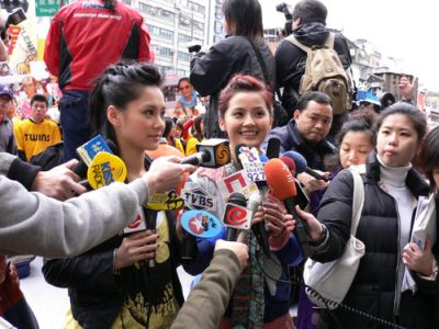 舉行活動當(dāng)日,唱片公司準(zhǔn)備了近三層樓高度的Twins巨型熱氣球,現(xiàn)場更準(zhǔn)備了登高機(jī)讓Twins在高處放巨型氣球,而氣球升起象征十萬連署成功。同時(shí),“英皇娛樂”租下巨型電子墻首播她們最新的主打歌《見習(xí)愛神》。Twins首次在臺灣出席大型活動便要登高,均表示十分害怕。