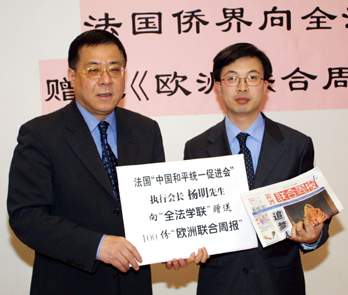 儀式上,法國“中國和平統(tǒng)一促進(jìn)會(huì)”執(zhí)行會(huì)長楊明、法國法華工商聯(lián)合會(huì)會(huì)長劉若申、法國企業(yè)界人士將各自捐贈(zèng)的報(bào)紙數(shù)額顯示牌分別交到全法學(xué)聯(lián)主席陳鵬、中國大使館教育處安少康一等秘書等人手中。捐贈(zèng)時(shí)限為一年。