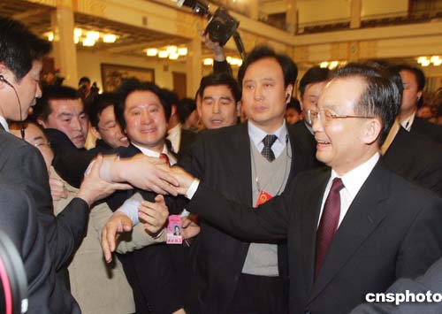 十屆全國人大三次會議三月十四日在北京人民大會堂閉幕,國務(wù)院總理溫家寶在閉幕會后舉行記者會。圖為溫總理在記者招待會結(jié)束后走到記者席前,與現(xiàn)場采訪的中外記者握手。作者:毛建軍