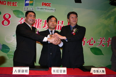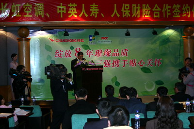 四川長虹電器股份有限公司黨委書記、副董事長劉體斌、中英人壽成都分公司總經(jīng)理吳傳成、人保財險四川省分公司副總經(jīng)理常川參加了簽字儀式,長虹空調(diào)公司總經(jīng)理李進博士、中英人壽助理總裁常穎、長虹空調(diào)(中國)營銷公司市場推廣部部長余皓就雙方產(chǎn)品及聯(lián)合營銷事宜向新聞媒體作了介紹。