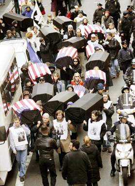 在英國首都倫敦,大約有4.5萬名民眾19日參加了以“讓軍隊回家”為主題的游行。游行民眾從海德公園出發(fā),經(jīng)過美國駐英大使館,前往特拉法加廣場舉行示威集會。他們一路高呼“喬治·布什……山姆大叔,伊拉克將是你的越南”等口號,并把一具寫有“十萬死者”字樣的黑色假棺材擺放在美國駐英使館門外。