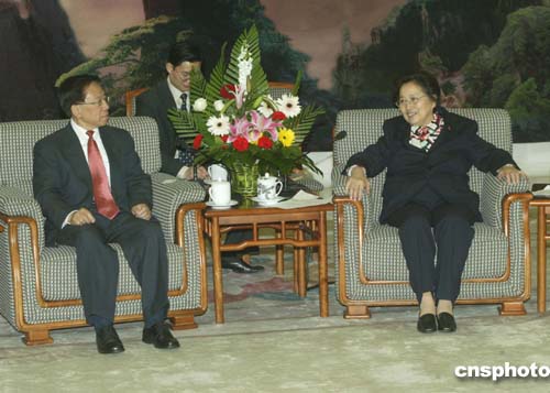 三月二十二日,全國(guó)人大常委會(huì)副委員長(zhǎng)何魯麗在北京人民大會(huì)堂會(huì)見吳顯揚(yáng)、關(guān)其煉團(tuán)長(zhǎng)率領(lǐng)的芝加哥中華會(huì)館訪華團(tuán)。作者:史利
