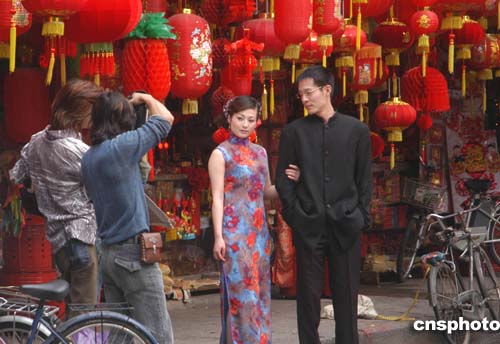 一名影樓攝影師春季在福州民俗街——南后街上為一對新人拍照片。這條匯聚了近代史人文景觀的古街,目前已成福州旅游觀光勝地。作者:鄭祚聲