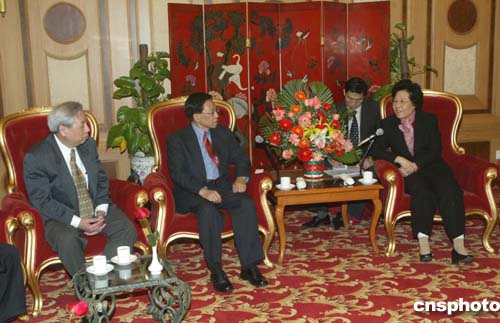 三月二十三日,中國國務(wù)院僑辦主任陳玉杰在北京世紀(jì)飯店會見吳顯揚(中)、關(guān)其煉(左一)團長率領(lǐng)的芝加哥中華會館訪華團。作者:史利