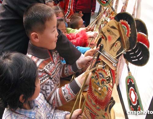 三月二十九日,鄭州一小學幾名孩子在老師指導下,學習擺弄傳統(tǒng)皮影。皮影戲產(chǎn)生于西漢民間,如今日漸失傳。河南鄭州民間皮影戲劇藝術家為搶救這種稀有的民間文化藝術,聯(lián)合了幾家中小學校,讓皮影戲走進校園。作者:慎重