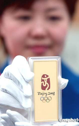 | 3月29日,“北京奧運(yùn)金”彩色系列第一組開始在北京菜百公司發(fā)售!氨本⿰W運(yùn)金”材質(zhì)為99.99%的黃金,分別為50克、100克和1000克三種規(guī)格,全國總發(fā)行量為1.75噸。據(jù)介紹,北京奧運(yùn)金彩色系列擬發(fā)5組相對(duì)獨(dú)立的產(chǎn)品,第一組紀(jì)念?yuàn)W運(yùn)會(huì)徽,其他組系的主要內(nèi)容為吉祥物,主場(chǎng)館,奧運(yùn)火炬,奧運(yùn)會(huì)開幕等。作者:韓藝冰