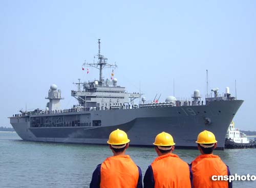 三月二十八日下午,美國海軍第七艦隊旗艦“藍嶺”號指揮艦在史蒂芬·梅拉德海軍上校的率領(lǐng)下抵達湛江軍港,開始對中國海軍南海艦隊為期三天的友好訪問。圖為美國海軍第七艦隊旗艦“藍嶺”號指揮艦抵達湛江港。作者:馬燦