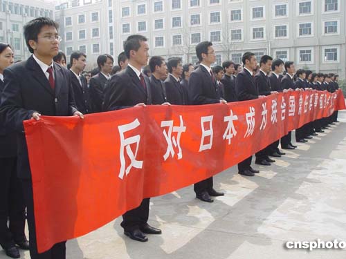 三十一日上午,河南檢察職業(yè)學(xué)院的數(shù)千名學(xué)生在該校的廣場(chǎng)上舉行了以“維護(hù)世界和平,反對(duì)日本加入聯(lián)合國常任理事國”為主題的大型簽名活動(dòng),以此表示對(duì)日本要求加入聯(lián)合國常任理事國的不滿。圖為活動(dòng)中,學(xué)生們自發(fā)打起“反對(duì)日本成為聯(lián)合國常任理事國”的橫幅。作者:史寶銀