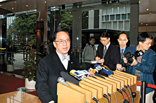 曾蔭權(quán)、律政司司長(zhǎng)梁愛詩、政制事務(wù)局局長(zhǎng)林瑞麟昨日開始分批會(huì)見立法會(huì)議員,昨日更率先與民建聯(lián)及民主黨的立法會(huì)議員會(huì)面。曾蔭權(quán)表示,會(huì)面的主要目的是希望探討所有實(shí)際而可行的方法,盡量確保在七月十日舉行的行政長(zhǎng)官選舉可以順利進(jìn)行。他說:“現(xiàn)時(shí)香港市民普遍都有一個(gè)期望,希望我們?cè)谄咴率漳軌蝽樌a(chǎn)生一位行政長(zhǎng)官,能夠掃除所有因?yàn)樾姓L(zhǎng)官出缺而可能受影響的政府運(yùn)作,以及社會(huì)活動(dòng),和一切不明朗的因素,特區(qū)政府與立法會(huì)議員也有同樣的責(zé)任去照顧所有市民的顧慮!
