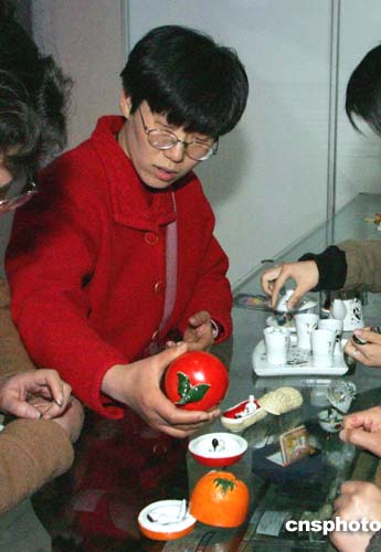 新近在上海著名的旅游風(fēng)景區(qū)——浦東陸家嘴觀光隧道內(nèi),一種顯示男女歡愛動作的、號稱“嫁女壓箱底”之物的旅游紀(jì)念品吸引了游客視線,它也是正在該地舉行的“中華性文化展覽”紀(jì)念品之一。圖為兩位中年婦女正在精心挑選該旅游紀(jì)念品。作者:潘索菲