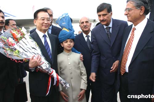 中國國務(wù)院總理溫家寶傍晚抵達(dá)伊斯蘭堡空軍機(jī)場,開始對巴基斯坦進(jìn)行為期三天的正式訪問。圖為溫家寶與給他獻(xiàn)花的巴基斯坦少年親切合影。