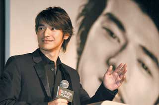 昨天的發(fā)布會設(shè)在劇場里面,舞臺兩邊早已掛起金城武最新拍攝的兩張碩大海報,一張溫文爾雅,一張則性感十足。當(dāng)金城武出現(xiàn)時,先是全場一片漆黑,然后又是一陣強光和一團煙霧,他一個人孤零零地站在寬大舞臺上接受著下面的驚聲尖叫,這種架勢持續(xù)了好幾分鐘,使得他不好意思地站起身來,一會兒摸摸腦袋,一會兒又把手插進褲袋。而當(dāng)主持人不斷向他拋來“你簡直驚若天人”、“你身上有卓然不同的男人氣質(zhì)”等贊美之語時,他雙手緊握著麥克風(fēng),不斷彎腰說謝謝。當(dāng)主持人問他喜歡現(xiàn)場掛的哪張廣告照片時,金城武謙虛地說:“不要再夸我了,其實突然看見這么大一張自己的臉,我覺得很別扭。”