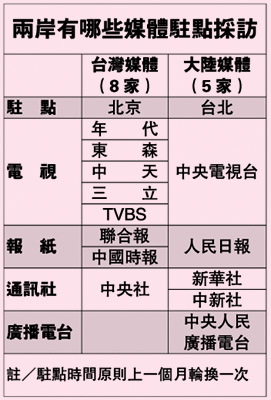 臺灣經過再三評估,在2000年11月公布“大陸新聞人員進入臺灣地區(qū)采訪注意事項”,正式開放大陸中央級媒體新華社、人民日報、中央電視臺、中央人民廣播電臺派員到臺采訪,時間也是1個月一輪。2001年2月,新華社記者范麗青、陳斌華成為大陸首批到臺駐點記者,一時成為新聞人物。