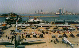 海上展艦區(qū)設(shè)在小青島連陸大堤的海灣內(nèi),那里停泊著退役的“長城號”潛艇、“鞍山號”導(dǎo)彈驅(qū)逐艦和“鷹潭號”航空導(dǎo)彈護(hù)衛(wèi)艦。鷹潭艦是我國第一代053K型艦對空導(dǎo)彈護(hù)衛(wèi)艦;鞍山艦是1954年我國從前蘇聯(lián)購進(jìn)的第一批驅(qū)逐艦,此艦有著不平凡的經(jīng)歷,1936年建成,1941年編入蘇海軍太平洋艦隊(duì),在第二次世界大戰(zhàn)中立下過赫赫戰(zhàn)功。