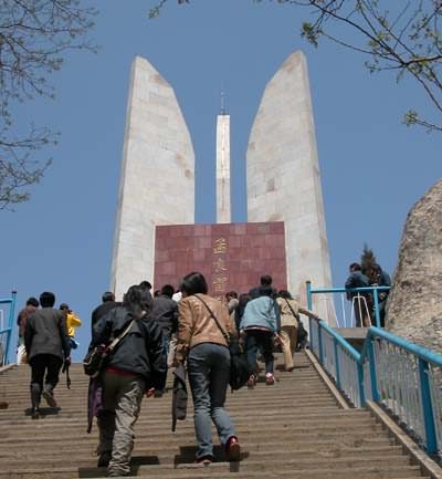 1984年為紀(jì)念孟良崮戰(zhàn)役在山上修建的紀(jì)念碑高30米,由三塊狀如刺刀的灰色花崗石筑成,象征著野戰(zhàn)軍、地方軍和民兵的武裝力量體制。底座為邊長20米、高1.6米的正三棱體,組成一個槍托,意喻槍桿子里面出政權(quán)。紀(jì)念碑的上下部構(gòu)成一個有機的整體,象征著軍民團結(jié)必勝,人民戰(zhàn)爭必勝。