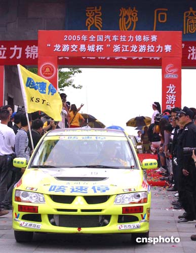中新社衢州四月二十三日電(記者 王歡)連綿春雨中,二00五年全國汽車?yán)﹀\標(biāo)賽“龍游交易城杯”龍游站比賽今天完成了第一階段九個賽段的艱苦拉力,參賽的六十六輛賽車中有近一半因意外退出。本土作戰(zhàn)的紅河拉力車隊徐浪表現(xiàn)搶眼,拿下九個賽段的六個第一,在N組(大排量組)參賽的中國車手中名列前茅。