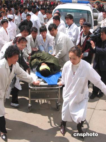 四月二十四日,吉林省吉林市蛟河奶子山騰達煤礦發(fā)生透水事故,六十九名礦工被困井下。經(jīng)連夜搶救,至二十五日十四時,已有三十九人獲救。圖為醫(yī)務人員正將獲救礦工緊急送往醫(yī)院進行救治。作者:呂陽
